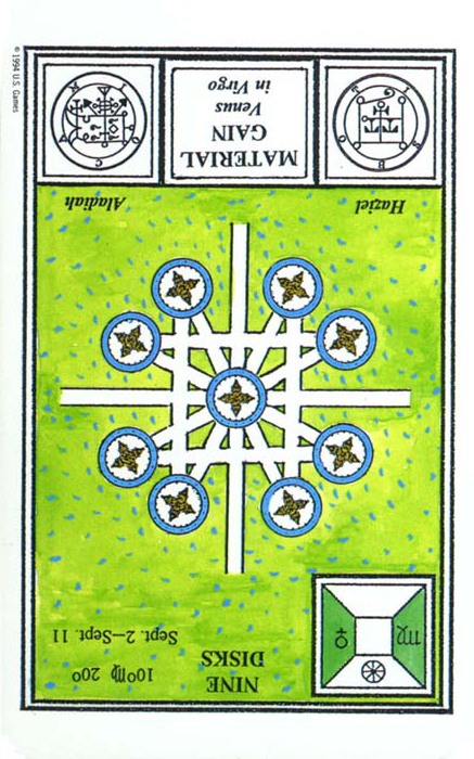 The 9 of Pentacles represents earned rest. The element Earth, attached to the Pentacles suit, appreciates the rest that completion of hard work brings. This is a good time for games and relaxation.