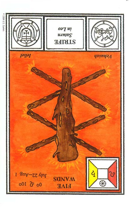 The 5 of Wands represents competition. The 5 is the second assignment number, and therefore a difficult card. 5 combined with the Wand's element fire challenges you. You'll have to fight hard for your idea, but you stand a good chance of succeeding.