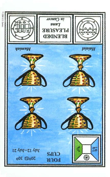 With the 4, the second cycle of this suit is commenced, where a choice between structure and feeling has to be made, where old securities have to be let go of to work towards a new future. But like Wands, Cups don't like structure much, they prefer to be free and dream rather than to make commitments and go for something.