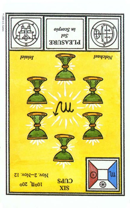 The 6 of Cups is about having confidence in something. It is the number of security and harmony. In the suit of Cups this means to be in harmony with yourself.