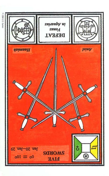 The 5 of Swords is about facing reality. The 5 is an assignment number, and in the slighly more difficult suit of Swords, it means you face a difficult challenge where your past experiences could hold you down.