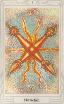 The 2 of Wands represents the research and digestion of a new idea. The number of this card and it's element are somewhat in conflict; while the 2 is focussed inwards, the Wand's element fire is outgoing. Fire wants to steam ahead while the blackbox 2 asks for patience.
