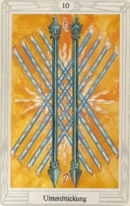 The 10 of Wands is therefore the transition from the element Fire (associated with Wands) to the element Water, associated with Cups. As you might imagine, this not the easiest of transitions.