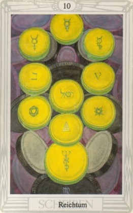The 10 of Pentacles represents material posessions. The number 10 of Pentacles forms the links to the Ace (first card) of Wands (the first suit in the minor Arcana), and thus prepares to bring you back to the beginning of the minor Arcana, ready for a next cycle through the tarot.