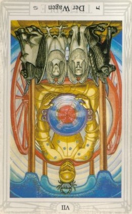 During the prevous card, The Lovers, all the wisdom of the first cards in the deck has been processed and a choice was made for personal growth. Now it's time to do something with all this baggage, to actually travel the road. A lot has been done so far, wisdoms have been accumulated and integrated into one's personality.