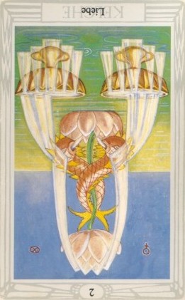This the first assignment number of the Cups suit. Unlike Wands, with the Fire element, Cups, with the water element, has a lot more patience. Water is by nature more introspective, and this second card in the Cups suit is indeed about exploring yourself. The outcome is uncertain as always, but it usually results in better acceptance of yourself.