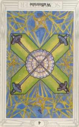 4 is the first number in the cycle of giving things shape. It's about making things real. The element of Swords also relates to making things real, so this enhances the effect so much that arrogance can cause you to exhaust yourself.