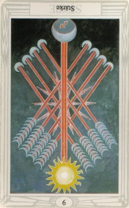 The 9 represents rest after work, which is another thing (like 8) that the element Fire associated with Wands is not very comfortable with. Fire likes to keep going. This rest will probably be spent thinking about what to do next along the course to completion.