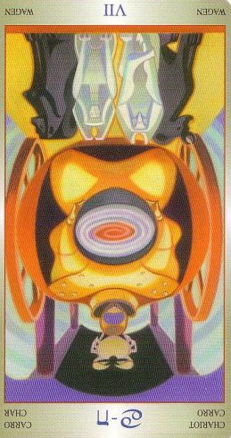 During the prevous card, The Lovers, all the wisdom of the first cards in the deck has been processed and a choice was made for personal growth. Now it's time to do something with all this baggage, to actually travel the road. A lot has been done so far, wisdoms have been accumulated and integrated into one's personality.