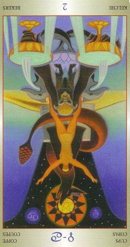 This the first assignment number of the Cups suit. Unlike Wands, with the Fire element, Cups, with the water element, has a lot more patience. Water is by nature more introspective, and this second card in the Cups suit is indeed about exploring yourself. The outcome is uncertain as always, but it usually results in better acceptance of yourself.