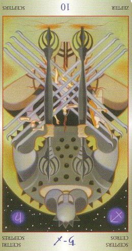 The 10 of Wands is therefore the transition from the element Fire (associated with Wands) to the element Water, associated with Cups. As you might imagine, this not the easiest of transitions.