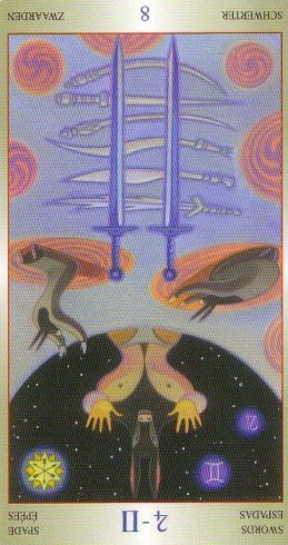 The 8 of Swords is about slowly regaining strength and energy. The 8 is an assignment number, and in the element of Swords it's a bit harder than usual.