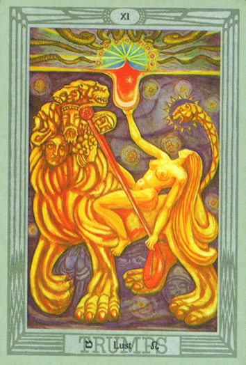 This card carries the number 11. In the Rider-Waite deck, Strength and Justice have swapped places because Waite saw links with the astrological signs Leo and Libra.