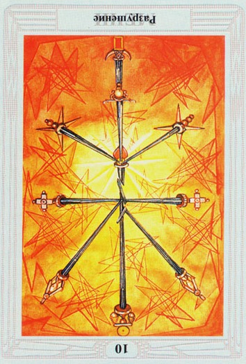 The 10 of Wands is therefore the transition from the element Fire (associated with Wands) to the element Water, associated with Cups. As you might imagine, this not the easiest of transitions.