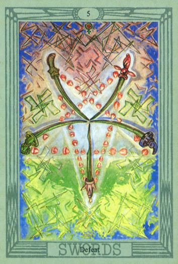 The 5 of Swords is about facing reality. The 5 is an assignment number, and in the slighly more difficult suit of Swords, it means you face a difficult challenge where your past experiences could hold you down.