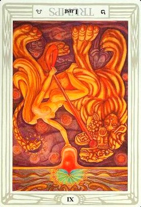 This card carries the number 11. In the Rider-Waite deck, Strength and Justice have swapped places because Waite saw links with the astrological signs Leo and Libra.