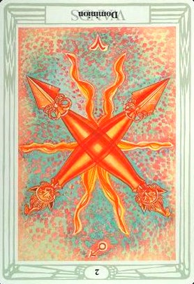 The 2 of Wands represents the research and digestion of a new idea. The number of this card and it's element are somewhat in conflict; while the 2 is focussed inwards, the Wand's element fire is outgoing. Fire wants to steam ahead while the blackbox 2 asks for patience.
