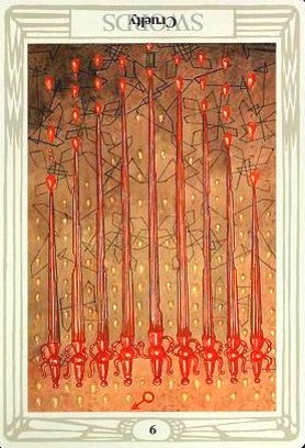 With the 4, the second cycle of this suit is commenced, where a choice between structure and feeling has to be made, where old securities have to be let go of to work towards a new future. But like Wands, Cups don't like structure much, they prefer to be free and dream rather than to make commitments and go for something.