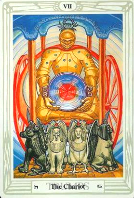 During the prevous card, The Lovers, all the wisdom of the first cards in the deck has been processed and a choice was made for personal growth. Now it's time to do something with all this baggage, to actually travel the road. A lot has been done so far, wisdoms have been accumulated and integrated into one's personality.