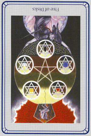 The 5 of Pentacles is an assignment-number card, and is about letting go of your securities. Pentacles element Earth (also) represents material posessions, so this card is about letting go of (some of) your worldly assets.