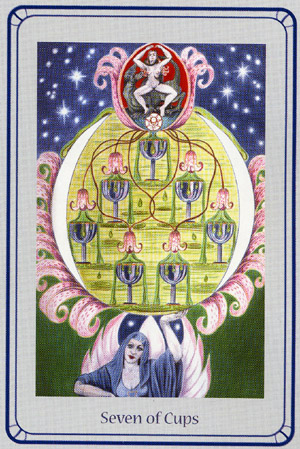 The 7 of Cups is about making a choice between different ideals. But Cups, with the water element, don't like making definitive choices that much, making this 7 in this suit a bit of a hard choice.