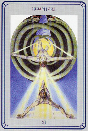 The Hermit shuts out the world and retreats into solitude to better understand some spiritual aspect of life. He opens to the cosmos and lets it's wisdom sink in. Hermits are often seen as wise old men who can guide a traveller along a journey.