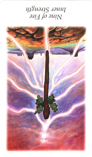 The 9 represents rest after work, which is another thing (like 8) that the element Fire associated with Wands is not very comfortable with. Fire likes to keep going. This rest will probably be spent thinking about what to do next along the course to completion.