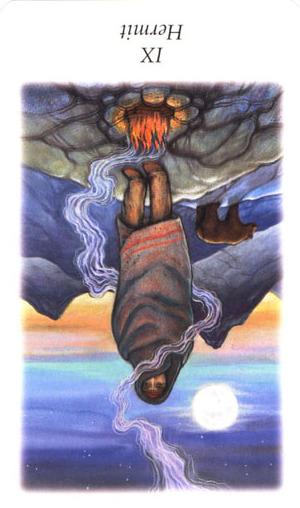 The Hermit shuts out the world and retreats into solitude to better understand some spiritual aspect of life. He opens to the cosmos and lets it's wisdom sink in. Hermits are often seen as wise old men who can guide a traveller along a journey.