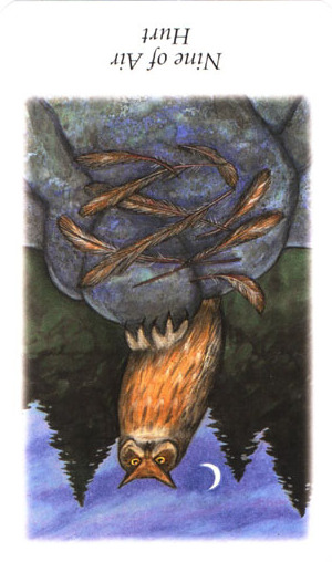 The 9 of Swords represents relief from cropped-up grief. The number 9 is a number of reward and rest and accomplishment. In the element of Swords there is not a lot of time for rest, but without any rest you'd just burn yourself out.