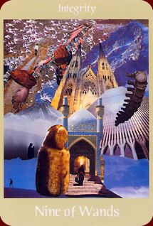 The 9 represents rest after work, which is another thing (like 8) that the element Fire associated with Wands is not very comfortable with. Fire likes to keep going. This rest will probably be spent thinking about what to do next along the course to completion.