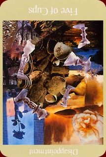 The 5 of Cups is about overcoming sadness and disappointment. You've let go of your old securities to embrace the new and exciting, now something has gone awry and you feel bad about that. But don't forget to notice those things that did go right.