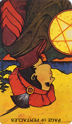 Pages explore and gather information about the road ahead, with an almost naive attitude. The Page of Pentacles is sometimes described as a bridge builder; Pentacles is the suit where the actual work is done, and the Page here enables those that follow to quickly cross difficult terrain.