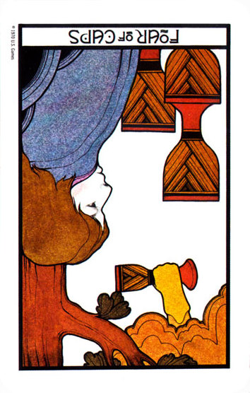 With the 4, the second cycle of this suit is commenced, where a choice between structure and feeling has to be made, where old securities have to be let go of to work towards a new future. But like Wands, Cups don't like structure much, they prefer to be free and dream rather than to make commitments and go for something.
