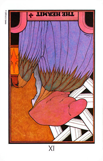 The Hermit shuts out the world and retreats into solitude to better understand some spiritual aspect of life. He opens to the cosmos and lets it's wisdom sink in. Hermits are often seen as wise old men who can guide a traveller along a journey.