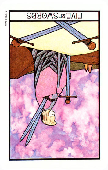 The 5 of Swords is about facing reality. The 5 is an assignment number, and in the slighly more difficult suit of Swords, it means you face a difficult challenge where your past experiences could hold you down.