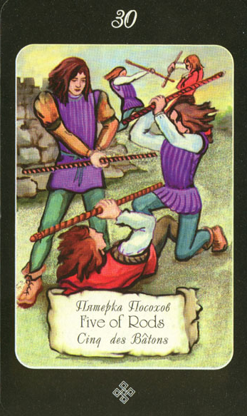 The 9 represents rest after work, which is another thing (like 8) that the element Fire associated with Wands is not very comfortable with. Fire likes to keep going. This rest will probably be spent thinking about what to do next along the course to completion.