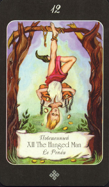 First you learned that you're not a plaything of fate, that you can make your own choices. Then you've learned how to fend for yourself and face yourself. Now, at The Hanged Man, you can learn to let go. You no longer have to cling to old values. You've found strength in yourself and by letting go, you allow growth.