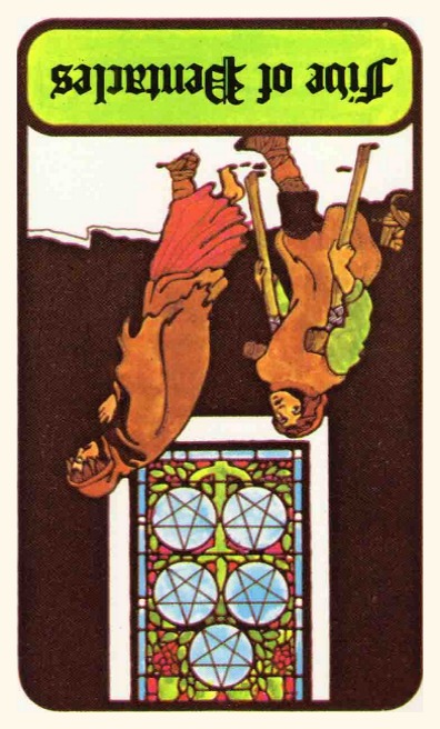 The 5 of Pentacles is an assignment-number card, and is about letting go of your securities. Pentacles element Earth (also) represents material posessions, so this card is about letting go of (some of) your worldly assets.