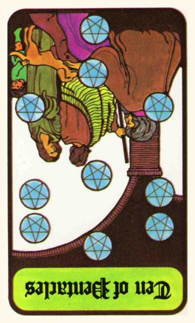 The 10 of Pentacles represents material posessions. The number 10 of Pentacles forms the links to the Ace (first card) of Wands (the first suit in the minor Arcana), and thus prepares to bring you back to the beginning of the minor Arcana, ready for a next cycle through the tarot.