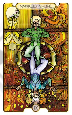 First you learned that you're not a plaything of fate, that you can make your own choices. Then you've learned how to fend for yourself and face yourself. Now, at The Hanged Man, you can learn to let go. You no longer have to cling to old values. You've found strength in yourself and by letting go, you allow growth.