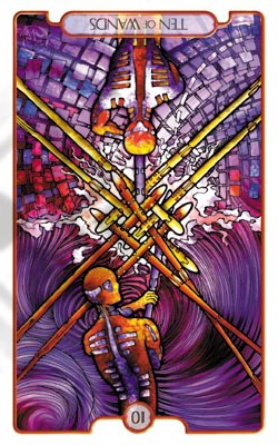 The 10 of Wands is therefore the transition from the element Fire (associated with Wands) to the element Water, associated with Cups. As you might imagine, this not the easiest of transitions.