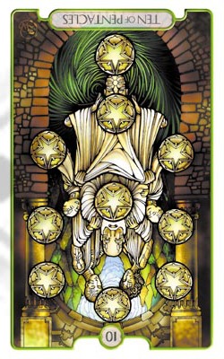 The 10 of Pentacles represents material posessions. The number 10 of Pentacles forms the links to the Ace (first card) of Wands (the first suit in the minor Arcana), and thus prepares to bring you back to the beginning of the minor Arcana, ready for a next cycle through the tarot.