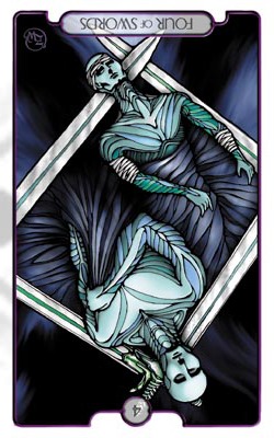 4 is the first number in the cycle of giving things shape. It's about making things real. The element of Swords also relates to making things real, so this enhances the effect so much that arrogance can cause you to exhaust yourself.