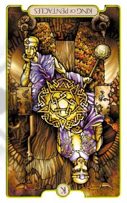 The King of Pentacles uses his Earthly attributes to rule. He goes about his work like an old style business man; he avoids unnecessary risks, aims for real results, and acts from confidence.