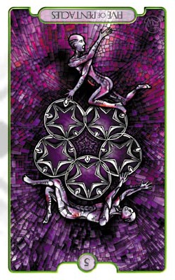 The 5 of Pentacles is an assignment-number card, and is about letting go of your securities. Pentacles element Earth (also) represents material posessions, so this card is about letting go of (some of) your worldly assets.