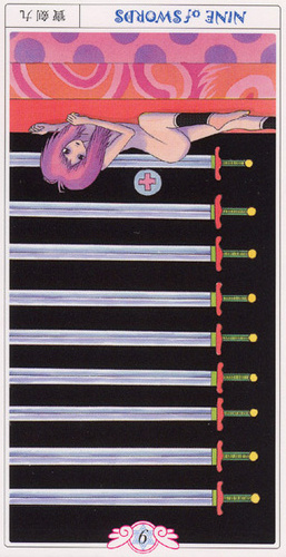 The 9 of Swords represents relief from cropped-up grief. The number 9 is a number of reward and rest and accomplishment. In the element of Swords there is not a lot of time for rest, but without any rest you'd just burn yourself out.