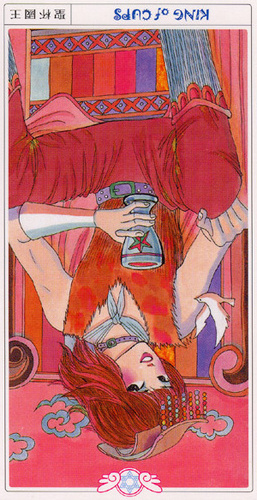 The King of Cups uses his intuition to achieve his ideals. Since Cups are turned inward, and Kings turned to the outside world, this card might be a difficult one, or it could be a powerful one.