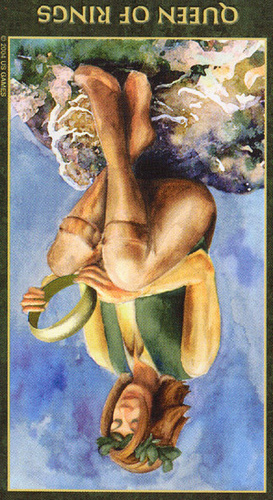 The Queen in the suit of Pentacles becomes aware of her Earthly attributes; she's reliable and sober, able to give good advice.