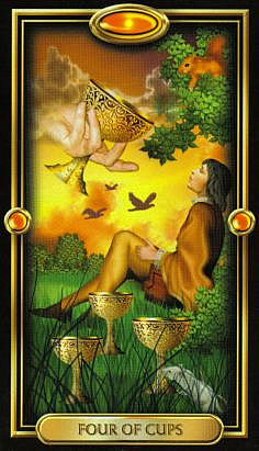 With the 4, the second cycle of this suit is commenced, where a choice between structure and feeling has to be made, where old securities have to be let go of to work towards a new future. But like Wands, Cups don't like structure much, they prefer to be free and dream rather than to make commitments and go for something.