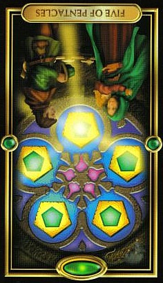 The 5 of Pentacles is an assignment-number card, and is about letting go of your securities. Pentacles element Earth (also) represents material posessions, so this card is about letting go of (some of) your worldly assets.